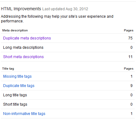 Sau khi công việc thiết kế web hoàn tất, bạn sẽ muốn xem mình đã onpage tốt hay chưa, hay còn thiếu sót giai đoạn onpage chỗ nào hãy truy cập vào menu Optimization/ HTML Improvements bạn sẽ nhận đuợc báo cáo về các vấn đề tối ưu hóa trên website của mình.